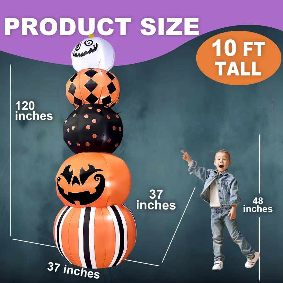 Striking Halloween Decoration: Our 10ft (Height) Halloween Inflatable Pumpkin Stack, measuring 37 inches in length, 37 inches in width, and 120 inches in height, is the perfect centerpiece for your Halloween decorations outdoor. This towering and eye-catching design captures attention, making your display the highlight of the neighborhood and an ideal choice for Halloween decorations outdoor