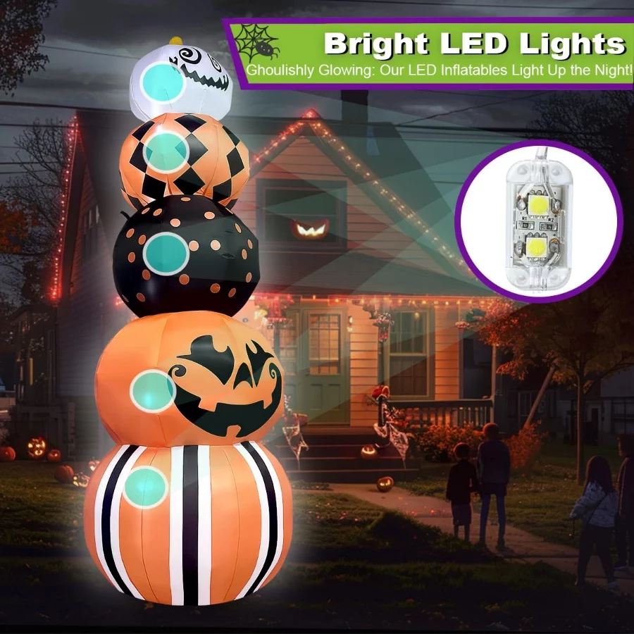 Vibrant LED Illumination: Featuring multiple built-in LED lights, this inflatable pumpkin stack glows brilliantly at night, enhancing the spooky ambiance of your Halloween decorations outdoor. The warm, inviting light ensures your yard stands out with a festive Halloween glow, perfect for any Halloween decorations outdoor setup