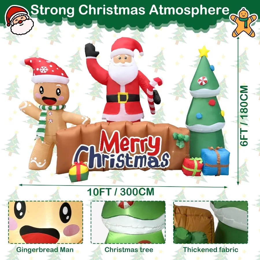10FT Merry Christmas Inflatable Sign with Santa, Tree & Gingerbread Man, LED Lighted Blow Up Decoration for Outdoor Lawn Winter Decor.