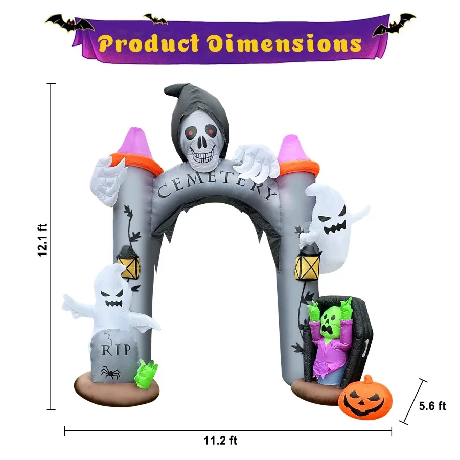 11.5FT Spooky Entrance: Create a show-stopping Halloween display with this giant inflatable cemetery archway featuring a grim reaper, ghost, and pumpkin. Its towering height makes it the perfect entrance for trick-or-treater, haunted house, or Halloween party