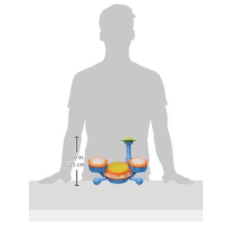 Kids learning toy has three drum pads and cymbal each with its own unique sound for sensory development.