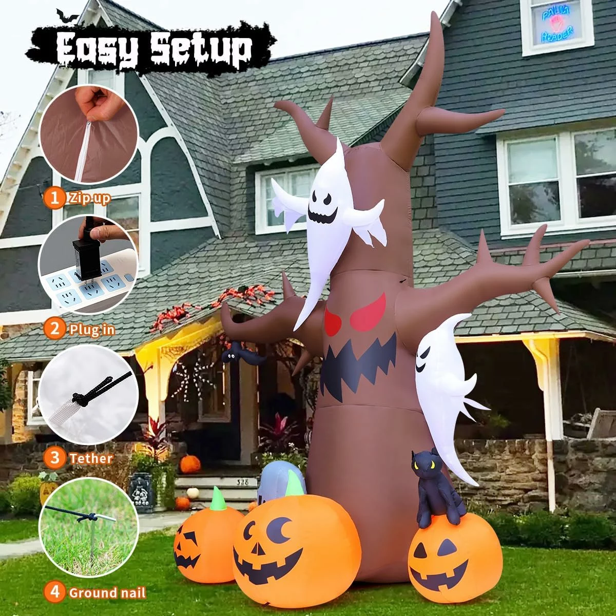 Giant Halloween Inflatables Tree: The 12 ft Halloween Inflatable tree decorated with tombstones and pumpkins; Tree surrounded by ghosts, the spooky atmosphere is chilling; The realistic look surprises every trick-or-treater and is sure to be a hit with kids, Built-in bright LED lights in the body; Create a spooky halloween atmosphere that make your home stand out on Halloween