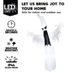 PREMIUM QUALITY UL Certified. This Halloween Inflatable ghost is safe and easy to set up, plug in, then everything pop-up right away. This Halloween yard decoration is made of high-quality waterproof polyester. Not easily torn. The excellent suture keeps it inflated all the time. So even if it is inflated for a long time, there will be no air leakage.