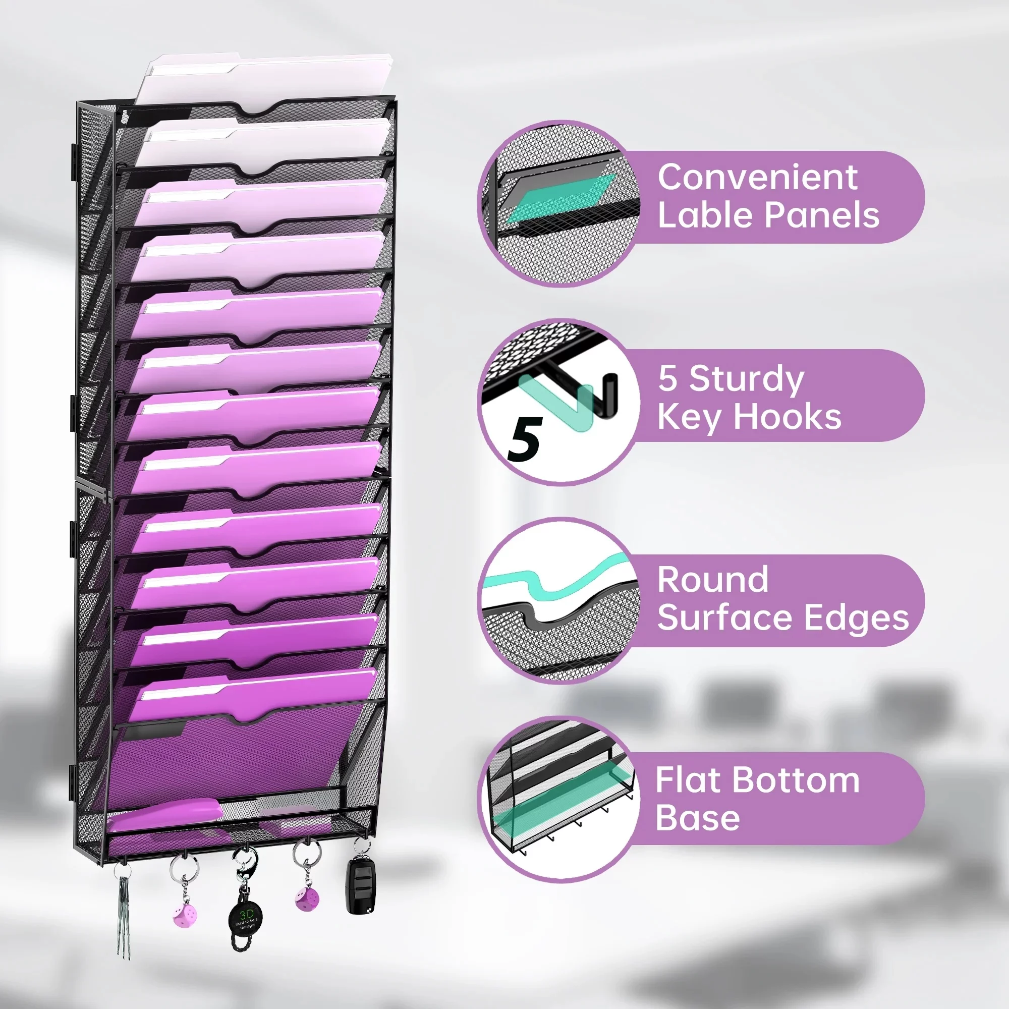 Humanize Design: Each wall file organizer with extra 5 sturdy key hooks, you can hang your keys and other small staffs. Hooks design for this wall file holder can remove the trouble to find your keys on the way out the door, saving time in searching.