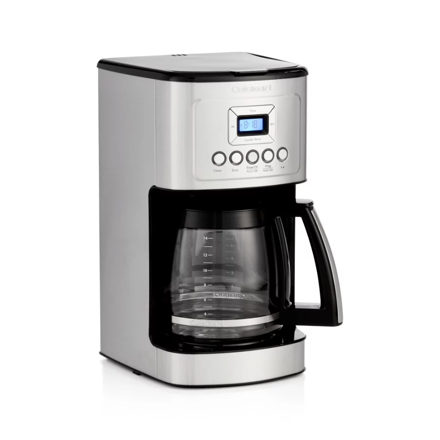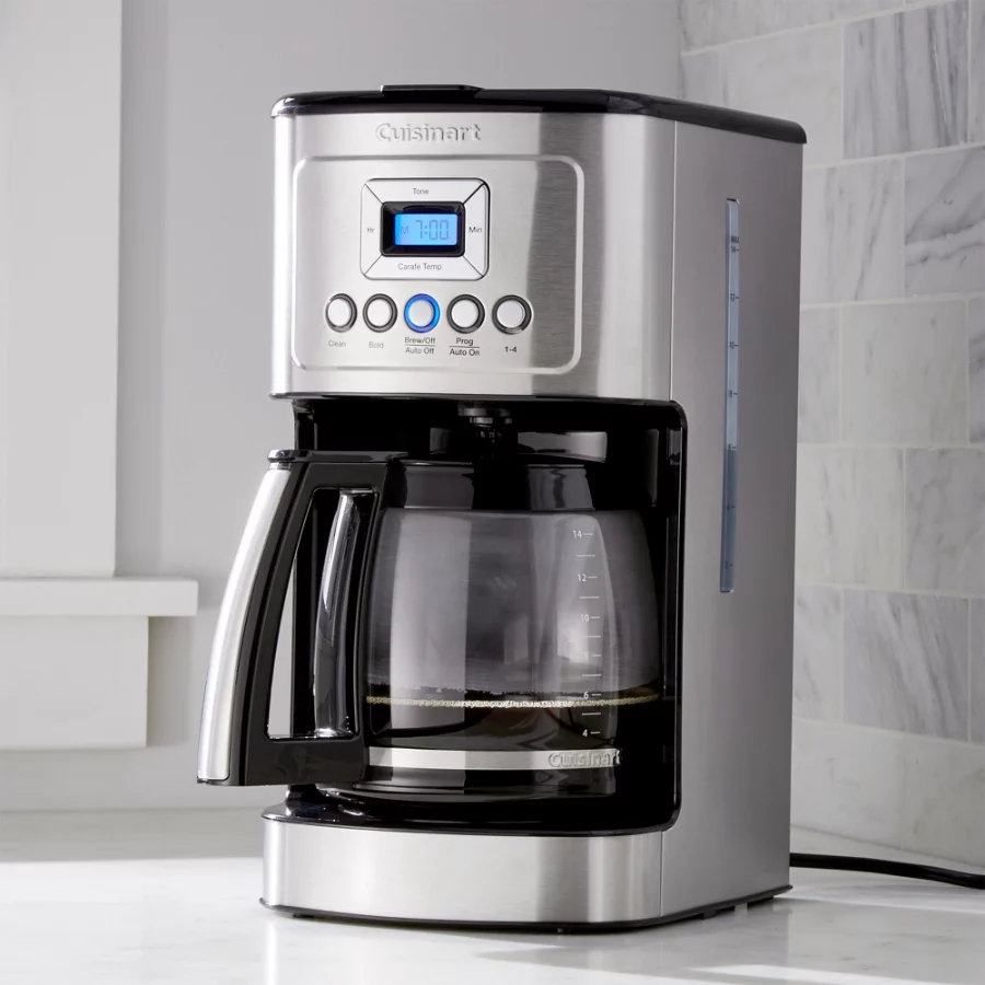 Brew hot flavorful coffee with a programmable 14 cup drip coffee maker designed for convenience and consistent results. The adjustable strength control lets you choose between a regular or bold brew while the brew pause feature allows you to pour a cup before the full cycle is complete. A reusable gold tone filter eliminates the need for paper filters helping reduce waste and simplify cleanup.