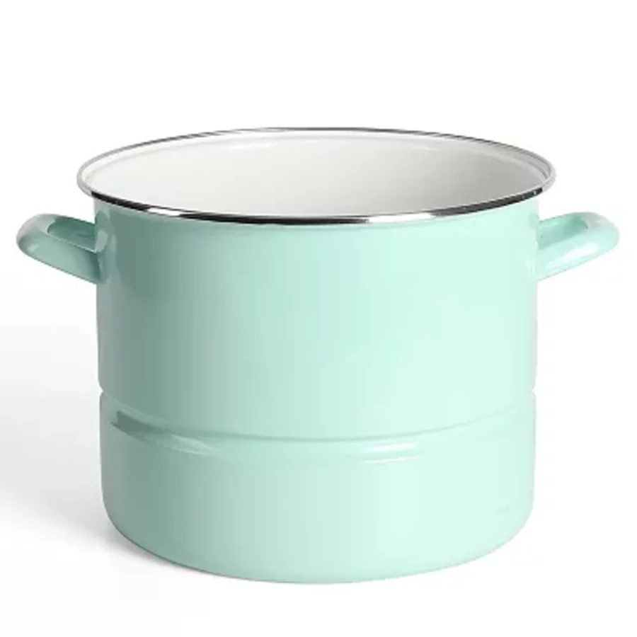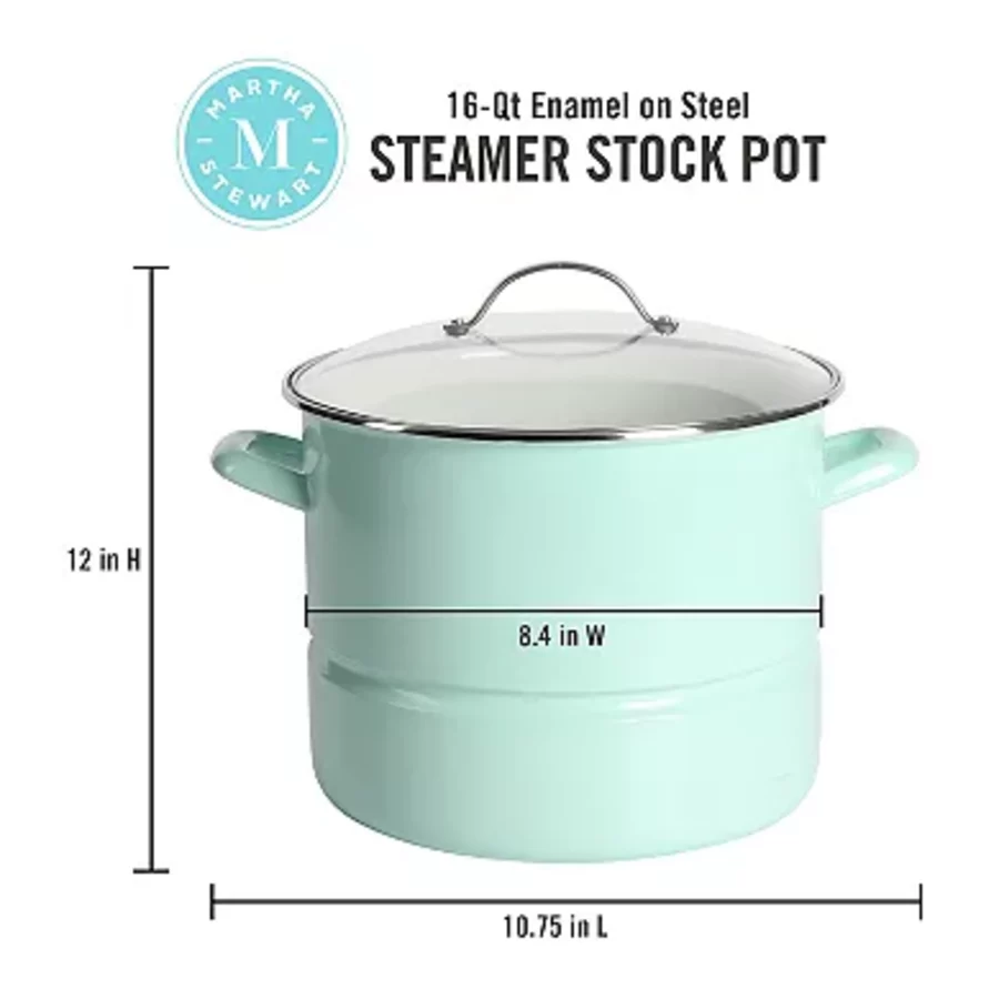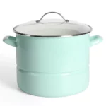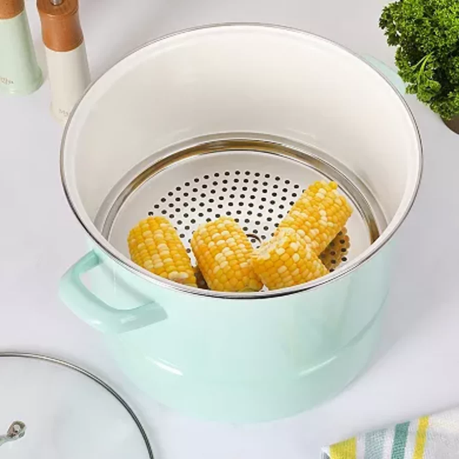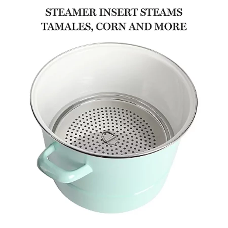 - What’s included: Enameled steel stock pot with stainless steel steamer and glass lid