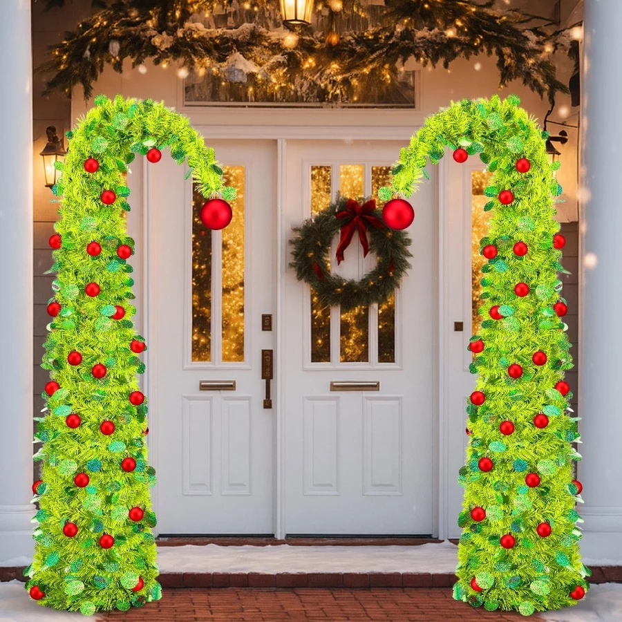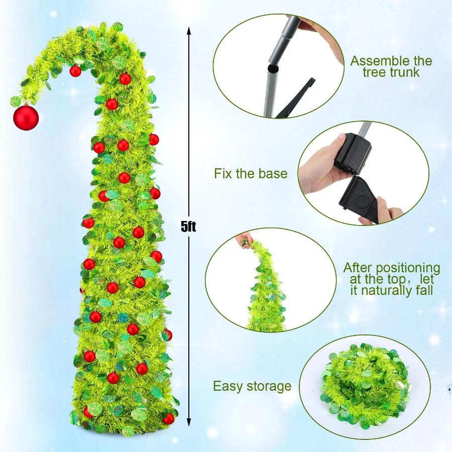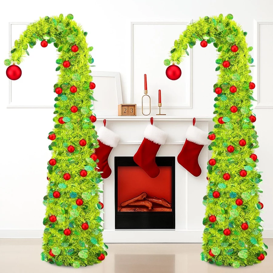 Complete Package: you will receive 2 pop up lime green bendable Christmas trees, there is a big red ball ornaments on the top and 48 small red ball ornaments on the tree, enough to meet your Christmas decoration needs.