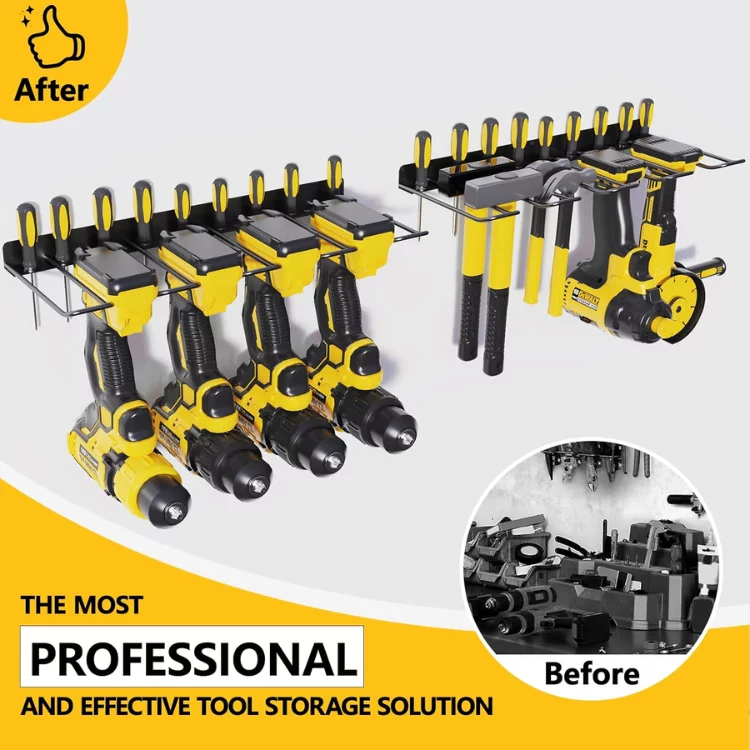 9 Front-Opening Designed Hanging Pins: Our garage power tool drill holder wall mount comes with 2 pcs with size 14.96 x 9.3 x 0.8 Inch/pcs. The front part of each equipped with 9 opening hanging pins, can store up to 4 drills or be used as hooks for more tools storage