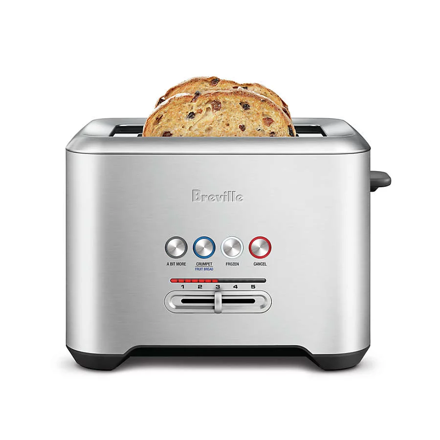 Toast large slices of artisanal bread thick bagels and dense pastries with a two slice toaster designed for even consistent browning. The extra wide and extra long slots easily fit oversized baked goods while one touch controls let you lift and look without stopping the cycle. The a bit more feature adds a small boost of browning when you want a slightly deeper shade.