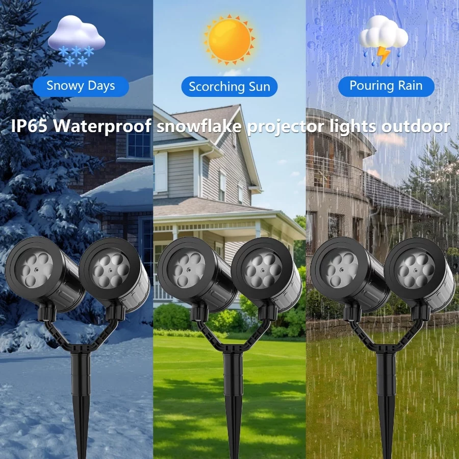 Christmas Double-Head Snowflake Lights: 2025 Christmas season, transform your home into a magical winter wonderland with our newly upgraded Christmas projection lights. Featuring a festive double-head snowflake projector, it casts four different dynamic snowflake patterns, creating a lifelike snowfall effect. Simply switch it on, and you and your family can enjoy the enchanting beauty of drifting snowflakes. Perfect for decorating your garden, house, lawn, or Christmas tree.