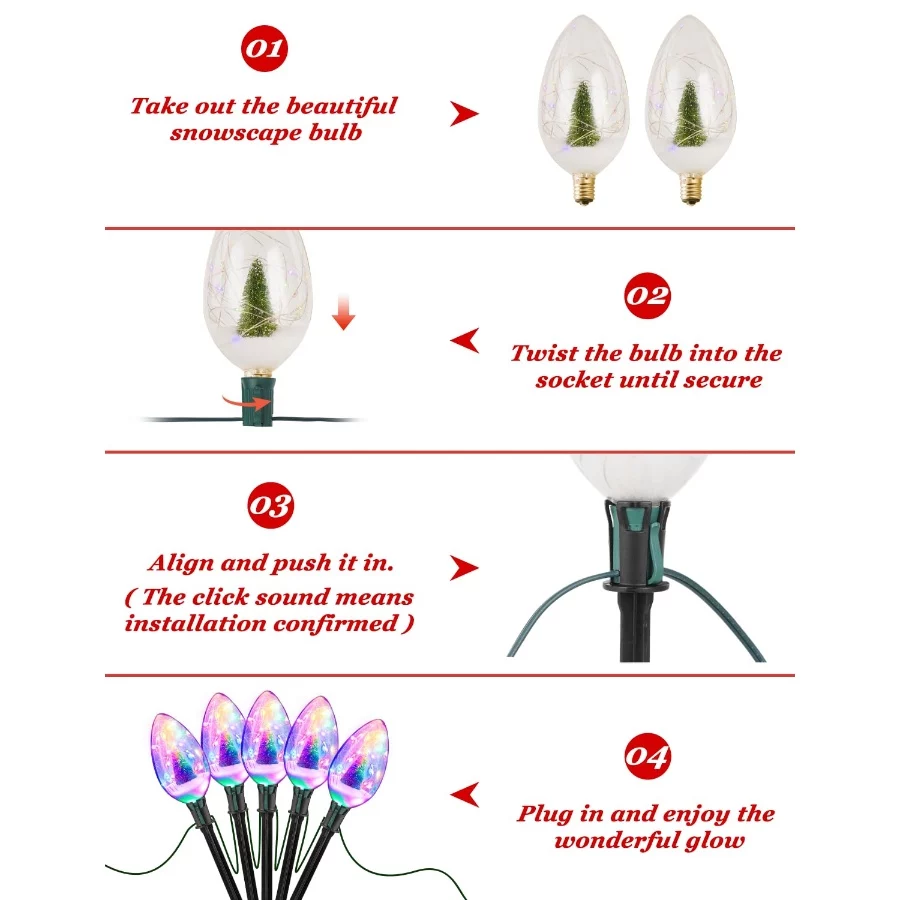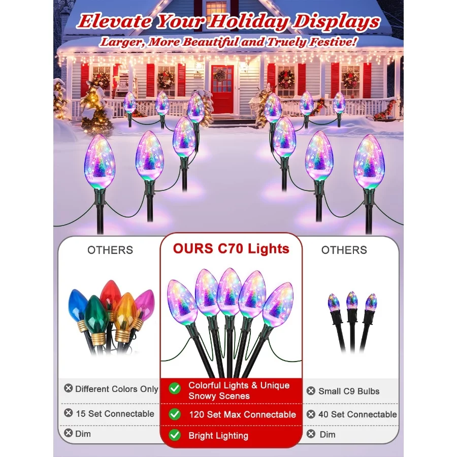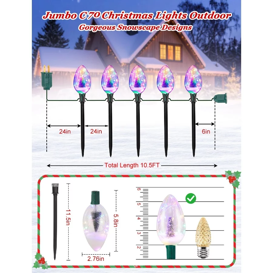 Jumbo Snow Bulbs & Enchanting Scene: Stand out with extra-large C70 bulbs—10 times bigger than standard C9 lights! Each transparent bulb features a miniature Christmas scene with delicate snowflakes, festive trees, and a soft-glowing LED string inside. The warm, gentle glow illuminates the snowy details without being harsh, creating a dreamy, crystal-ball-like effect that turns your yard into a magical winter storybook.