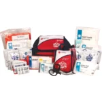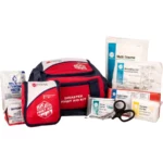- Sanitation supplies include three biohazard bags, three hand wipes, and a pack of tissues for hygiene maintenance.