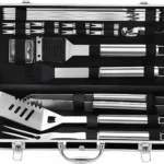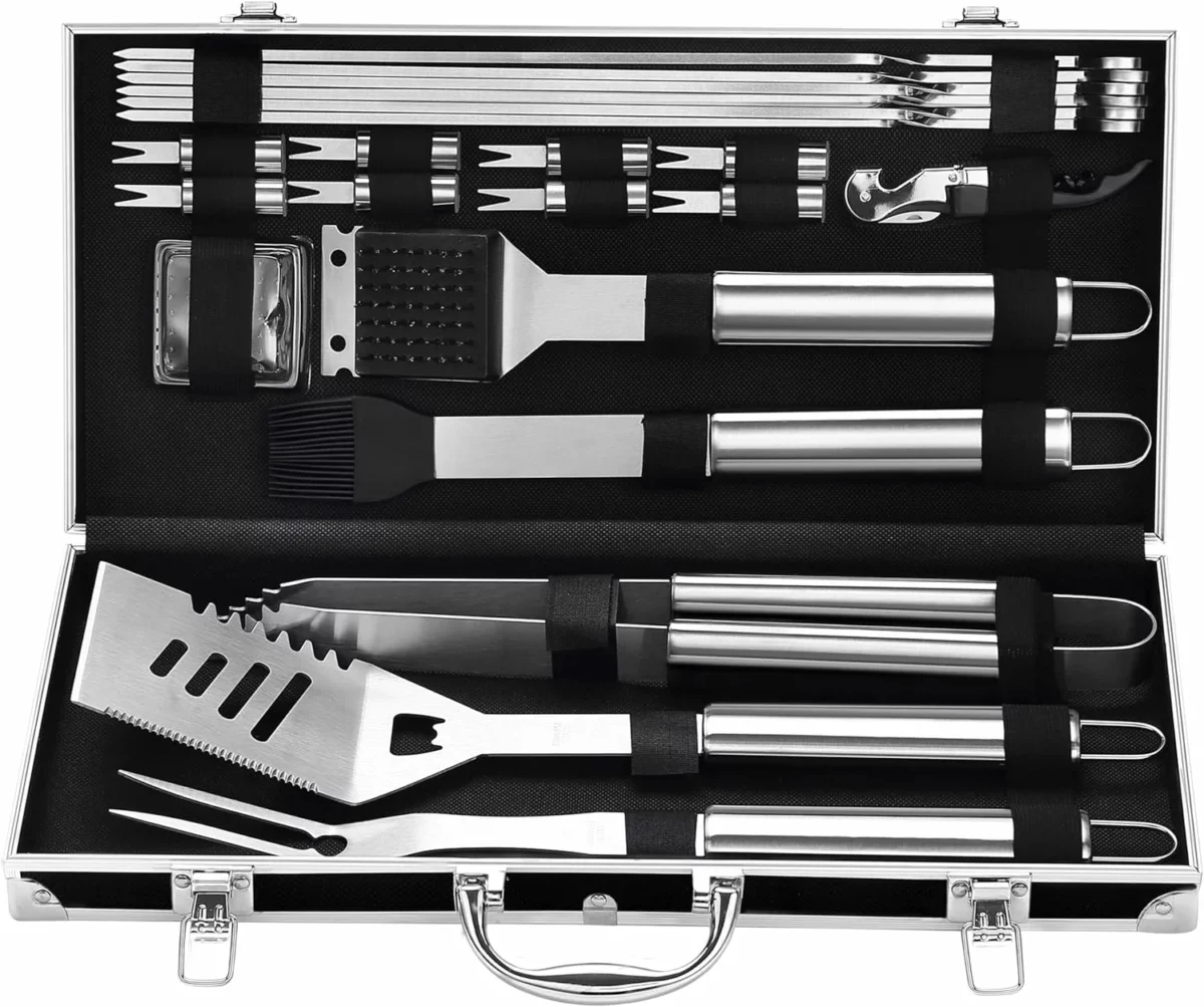 Complete Grill Accessories Set – This 22 piece barbecue tools set includes a tongs, spatula, basting brush, corkscrew, fork, grill brush with a replacement head, 6 skewers and 8 corn holders. All these BBQ tools are neatly organized in a sleek aluminum box, ensuring that your grill tools are protected. This grill set is the epitome of comprehensive and professional grilling equipment, perfect for enhancing your outdoor barbecue experiences.