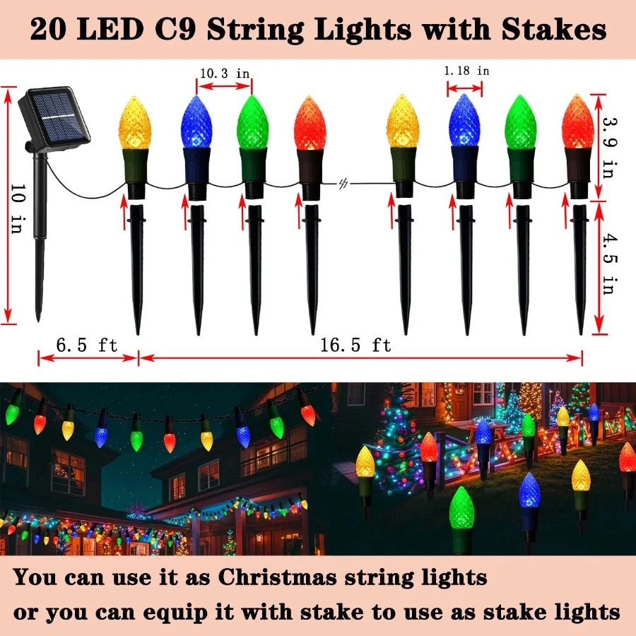 20 LED C9 Christmas Lights Outdoor: 23 feet C9 Christmas pathway lights with 20 C9 strawberry bulbs. 10.3 inches light spacing, 20 sturdy stakes, multicolor(red, green, blue, yellow) lighting effect. This Christmas lights for the sidewalk will be great for your pathway, garden, courtyard, outside Christmas decorations. It is also an exquisite gift for friends, families or relatives.