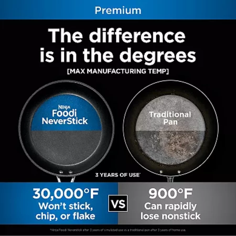 I have a full set of the Ninja Foodi NeverStick Premium cookware and love it. I bought two of these 8-inch Fry pans. Since I am cooking for two, this pan works great for cooking breakfast sausage links for two. I bought another of these, and use both at the same time to cook omelets for my husband and I. They are the perfect size for a personal-sized omelet using 2-3 eggs. They also work well for making 8-inch quesadillas. Brown a tortilla in the pan, add the fillings (cooked ground beef, black beans either refried or drained canned beans, cheese, etc. ), top with another tortilla, and flip to brown the top tortilla. Another favorite is to cook scrambled eggs in the pan without breaking it up. After the egg is cooked (I also add diced onion and green pepper to the egg), slide it onto an 8-inch tortilla, add cheese such as Velveeta. After the tortilla is browned, put another 8-inch tortilla on top, and flip it to brown the top tortilla. So good!! What I love about the Ninja Premium cookware is: 1) It is totally nonstick without seasoning. 2) It doesn’t scratch even if using metal utensils. 3) It is dishwasher safe, but I hand wash mine since it is so easy to clean. 4) They sear foods as well as cast iron without the maintenance. 5) They can be used in the oven up to 500 degrees F. 6) The exterior of the pots and pans are also anodized so they don’t scratch like stainless steel or pots with painted exteriors, such as Staub and Le Creuset which I also have. What I do question is the Ninja warranty on these pans. I bought the lids for these pans separately, but most often, when buying sets the lids are included with the pans. On the sets, the boxes state there is a 5-year warranty on the set. If you register the set on the NinjaKitchen.com website, the warranty is 10 years. This, to me, indicates the entire set is included in the warranty. I recently found out this is not the case. I used this pan with the cover to cook breakfast sausage links, and noticed some of the grease splatters must have gotten between the glass on the cover and the metal rim. There is now way to clean this out. I called Ninja customer service and was told that the lids are not included under the warranty – only the pans. In my opinion, the area between the glass on the lid and the rim should have been sealed to prevent this problem and feel this is a manufacturing defect. At any rate, it should be noted that pots and pans are covered under the warranty, but lids are not. I hope this review was helpful for you.