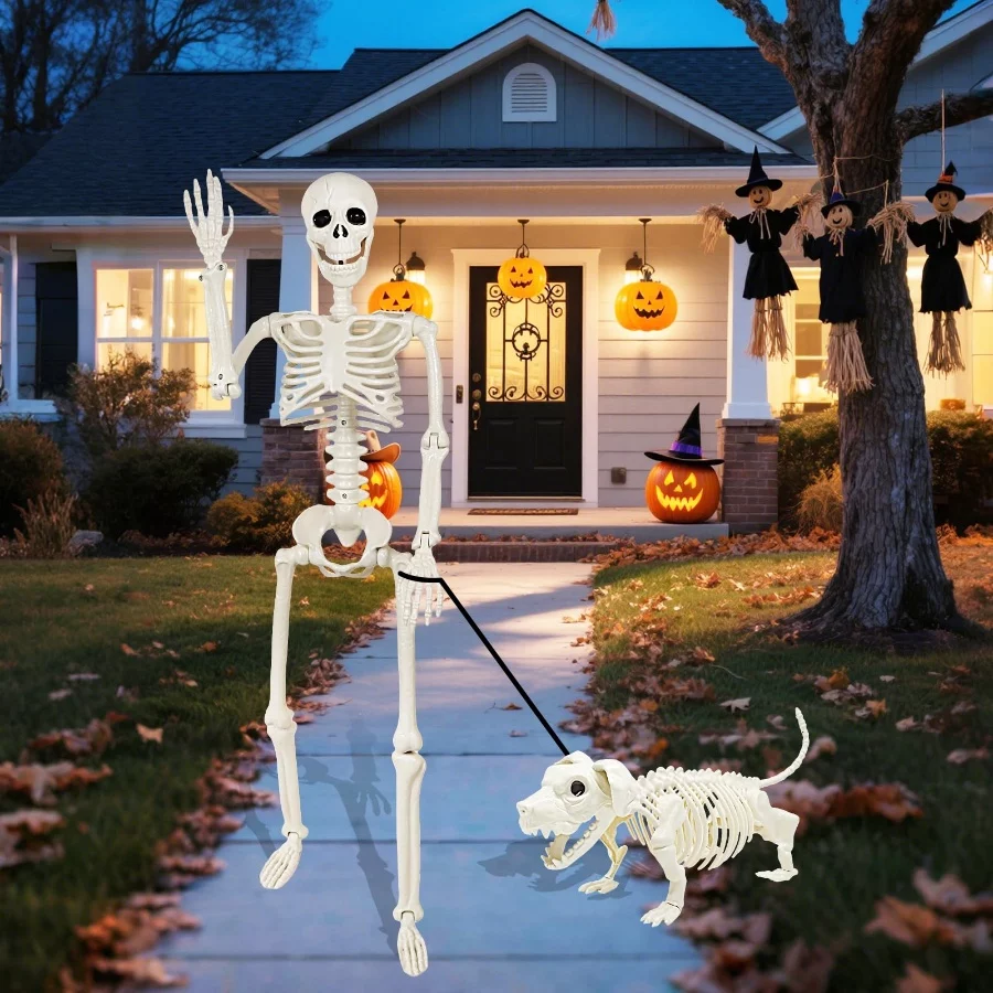 Easy to Install: The human skeleton only needs to insert the skull into the cervical spine, the dog skeleton does not require installation. Whether standing, sitting, lying or hanging, it will become your most unique decoration this Halloween. The skeleton decor allowing for endless creative possibilities, allowing for a different Halloween display every year and arouse the appreciation of candy-seeking kids.