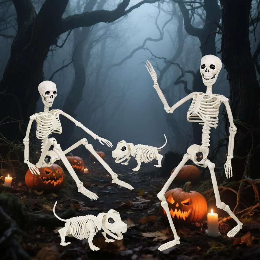 Value Halloween Skeleton Packs: You will receive 1Pack 3ft/36” Full body skeleton and a longth 15” dog skeleton with bendable joints and limbs, flexible and sturdy, You can any pose that you like. Easy to store when folded. The dog skeleton with skeleton man will add a splash of fun and create a scary atmosphere to your Halloween.