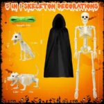 Posable Skeletons for Creative Displays: This 5-in-1 Halloween skeleton bundle includes a 36-inch skeleton, a cat skeleton, and a dog skeleton, as well as a complimentary cape and a fluorescent rope. Every joint can be posable of the 36-inch skeleton. The head and mouth of the cat and dog skeletons can be posable which enables you to create many dynamic and personalized scenes!