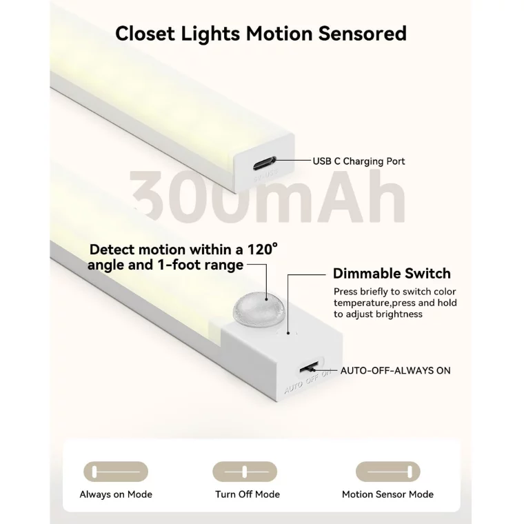 Smart Motion Sensor & 2 Modes: Automatically turns on under cabinet lighting within 10 feet and 120° detection range for convenient hands-free operation. Select Always-On Mode for continuous, reliable lighting, or Night Mode for smart activation in dark environments—ideal for busy households, nighttime tasks, and late-night convenience.