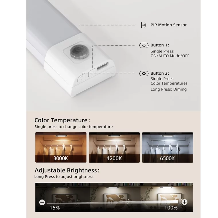 Versatile Lighting for Multiple Space: This 30 LED under cabinet light delivers bright, even illumination—ideal for closets, kitchens, pantries, bedrooms, offices, and workshops. Effortlessly brighten dark corners, storage spaces, and work areas throughout your home, with reliable, energy-efficient performance.