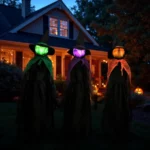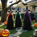 INTERACTIVE DISPLAY: Witches are positioned holding hands in a circle formation, creating a captivating scene for Halloween festivities.