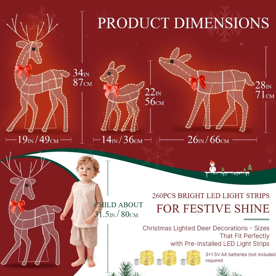 Two Lighting Modes, Battery Operated – Most outdoor reindeer Christmas decorations only glow steady. Our upgraded deer include two light modes (steady-on & flashing), controlled by a simple button. Each deer requires 3×1.5V AA batteries (not included). Note: battery box is not waterproof. Ideal for Christmas outdoor decorations, yard lawn holiday decor, light up reindeer outdoor Christmas, and holiday outdoor displays.
