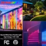 ETL Certified & Long Lifespan: ETL-listed RGB outdoor led rope lights made with pure copper wire. Includes a spare fuse without UV or mercury, making it safer for indoor and outdoor use. Anti-yellowing and flame retardant thick silicone material generating minimal heat properties Ensures bright, uniform illumination with a life expectancy of up to 50,000 hours. AC high volt 110-130V plug and play, no DC adapter needed. greater durability than traditional lighting fixtures Working temperature -4 ℉ to 120 ℉, Whether you’re decorating for a party, highlighting architectural features, or creating a unique ambiance, this neon rope light is a great choice.