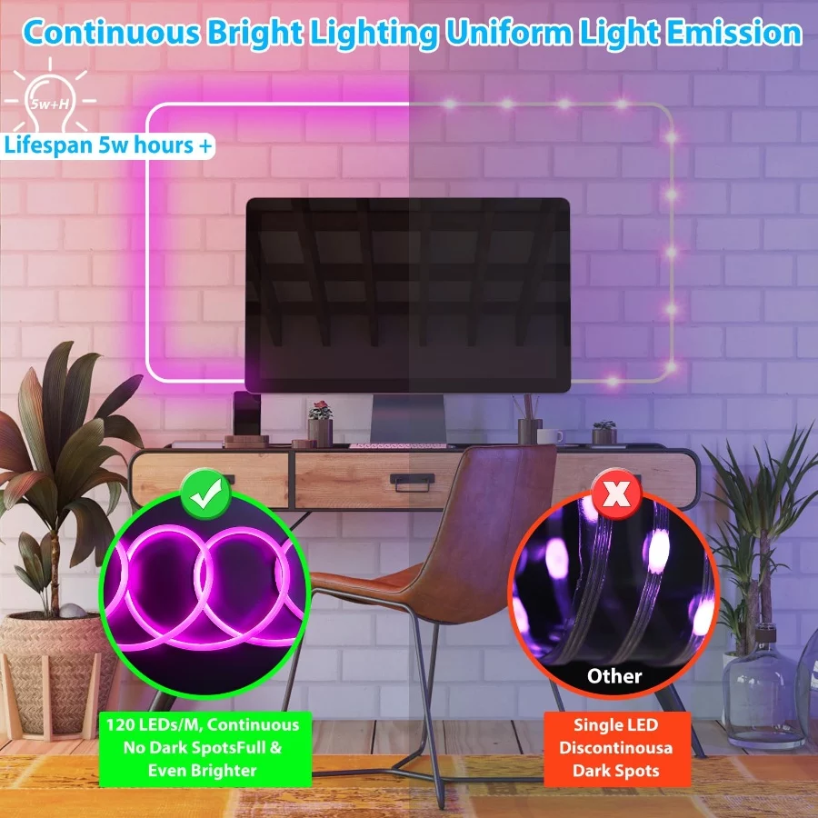 ETL Certified & Long Lifespan: ETL-listed RGB outdoor led rope lights made with pure copper wire. Includes a spare fuse without UV or mercury, making it safer for indoor and outdoor use. Anti-yellowing and flame retardant thick silicone material generating minimal heat properties Ensures bright, uniform illumination with a life expectancy of up to 50,000 hours. AC high volt 110-130V plug and play, no DC adapter needed. greater durability than traditional lighting fixtures Working temperature -4 ℉ to 120 ℉, Whether you’re decorating for a party, highlighting architectural features, or creating a unique ambiance, this neon rope light is a great choice.