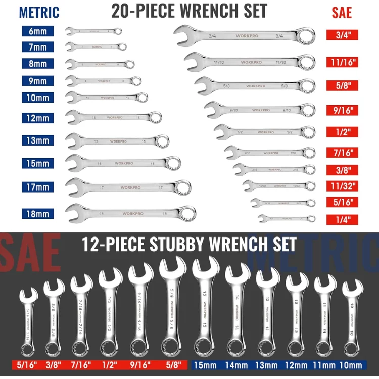 32 PC HIGH QUALITY WRENCH SET: 10-piece SAE- 1/4″”, 5/16″”, 11/32″”, 3/8″”, 7/16″”, 1/2″”, 9/16″”, 5/8″”, 11/16″”, 3/4″” and 10-piece Metric- 6, 7, 8, 9, 10, 12, 13, 15, 17, 18mm; 6-piece Stubby SAE- 5/16″”, 3/8″”, 7/16″”, 1/2″”, 9/16″”, 5/8″” and 6-piece Stubby Metric- 10,11,12,13,14,15mm. A wide variety of tools for the best possible results