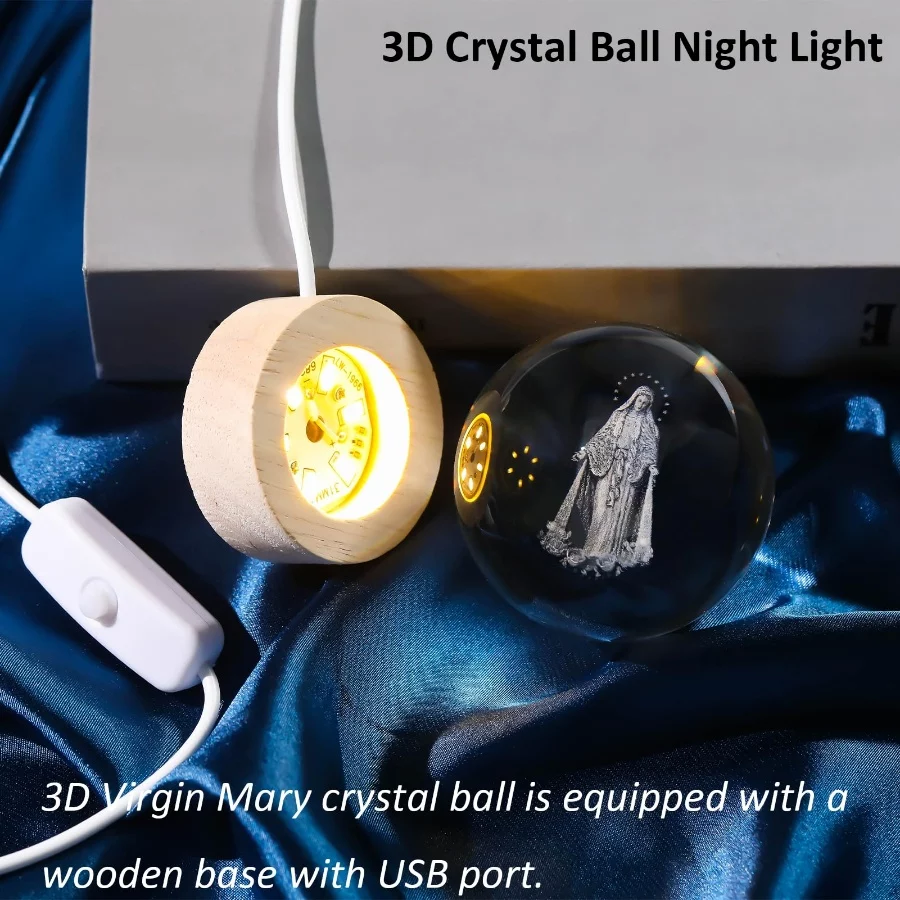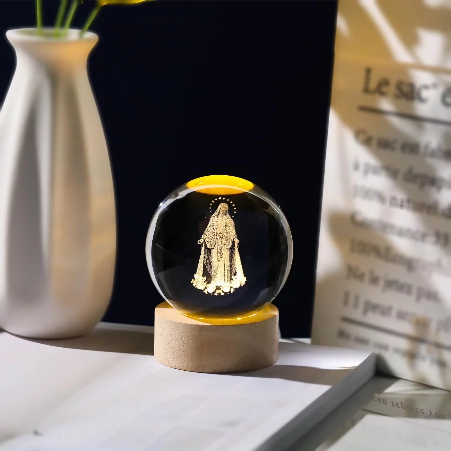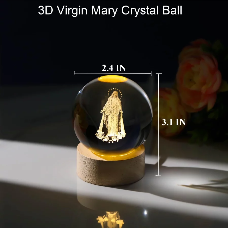 3D Crystal Our Lady of Guadalupe Statue, Laser Etched Virgin Mary Glass Ball Figurine with Wooden Base, Religious Christian Easter Gift Decor