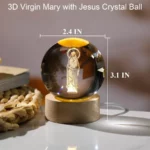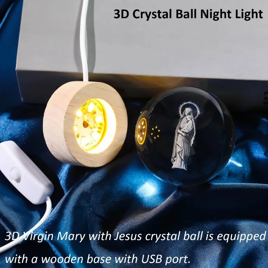 3D Laser Engraved Virgin Mary and Child Jesus Crystal Ball, Glass Sphere Figurine with Wooden Base, Christian Catholic Religious Gift for Home Decor