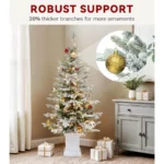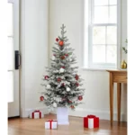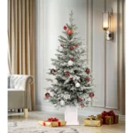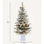 4.5FT Potted Flocked Arctic Fir Pencil Tree – Slim Pre-Lit Christmas Tree with 100 Lights & Red Hollies for Home or Office