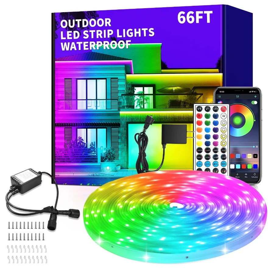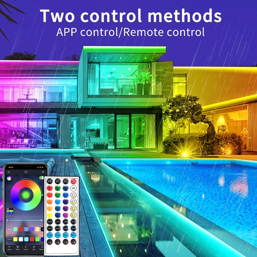 App & IR Remote – Waterproof Led Strip Lights Use APP and IR remote, APP has many operating modes, Music Sync, Timer function and other functions, easy and fun.Use the Outdoor Light Strips the Download APP”Lotus Lantern”. Remote control is simple to use, a wide range of control.