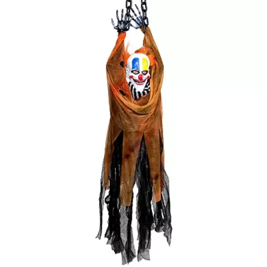 - Touch- and sound-activated design triggers creepy clown music and taunting phrases for an interactive scare experience.