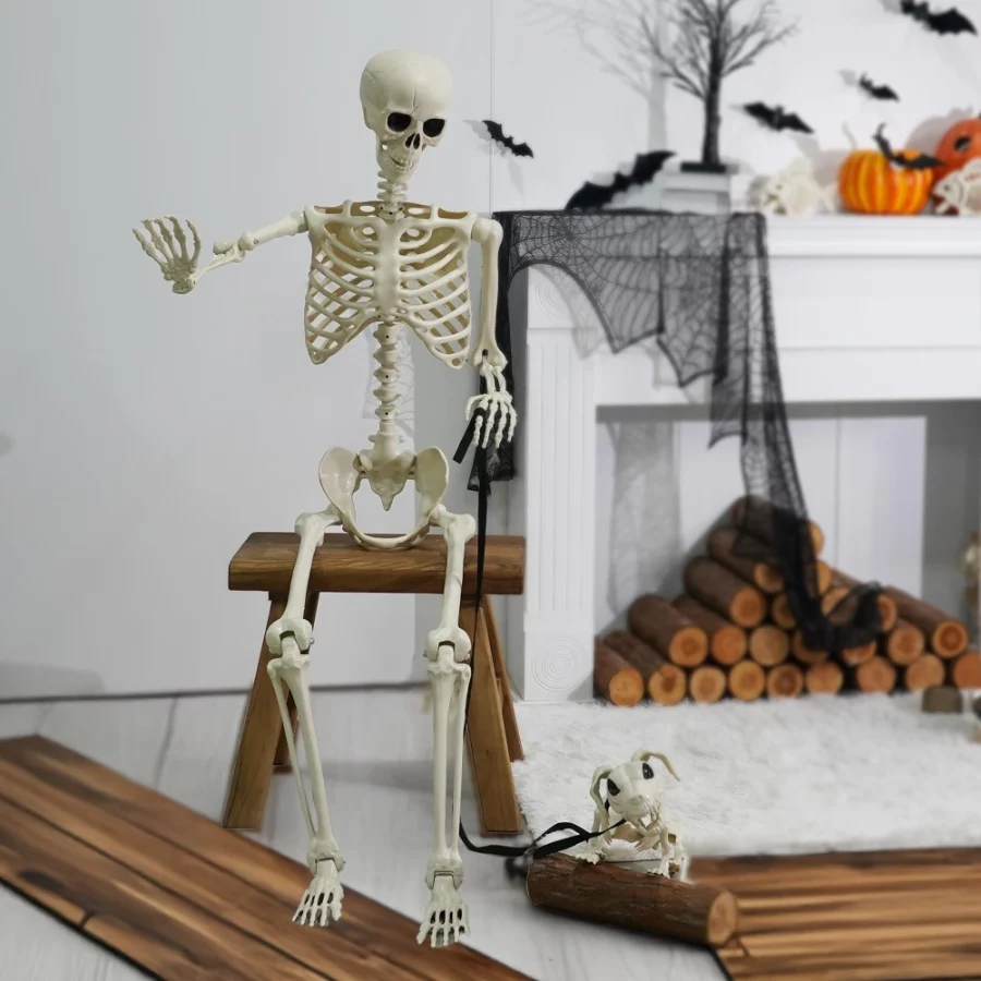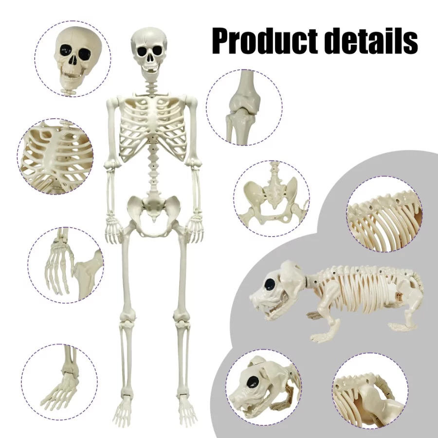 Posable and Lifelike: The life-size human skeleton has a movable head, jaw, and limbs, allowing you to adjust its posture to fit various scenes, such as standing or sitting. The dog skeleton also features movable jaws, head, and tail, enhancing its lifelike appearance.