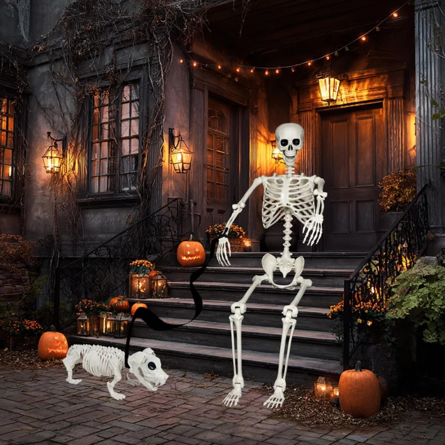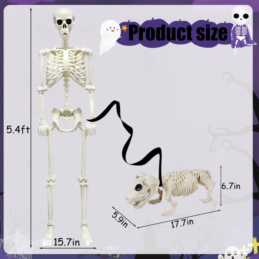 Spooky Halloween Decor Set: This Halloween decor set features a life-size human skeleton standing 5.4FT (H) x 15.7 In (W), a dog skeleton measuring 17.7 In (L) x 5.9 In (W) x 6.7 In (H), and a black dog leash. It adds a detailed and eerie touch to your Halloween decorations.
