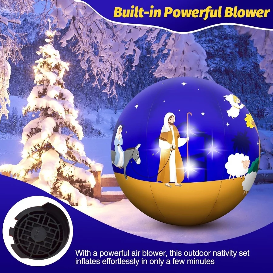 Automatic Power Blower: This blow up nativity scene outdoor comes with a built-in powerful blower for convenient and quick inflation. Place a water bag inside the inflatable, zip it up, plug it in, and the blower will inflate it quickly and efficiently, taking just a few minutes to get into shape, saving you time and effort to easily set up the Christmas scene.