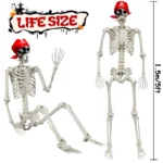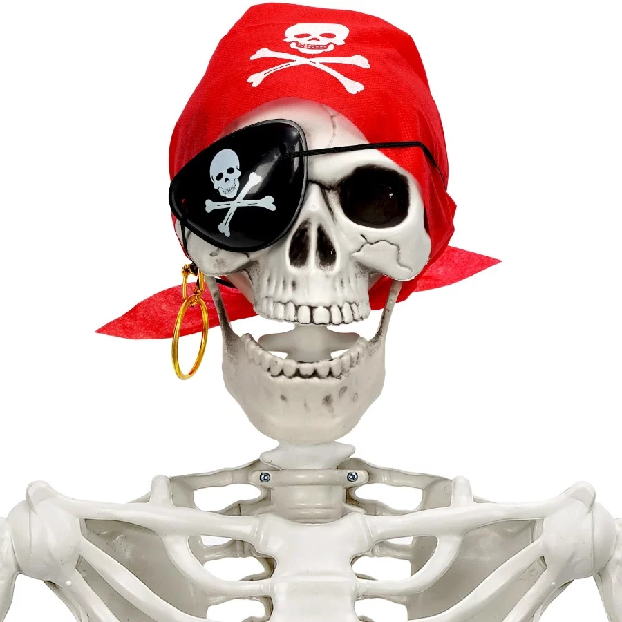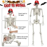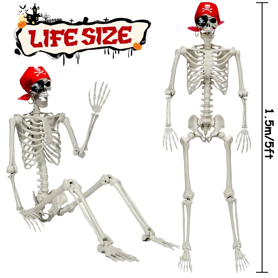 Premium Quality: 5 FT tall Halloween skeleton decorations feature a realistic skull, posable arms and legs, a golden earring, a pirate bandana and an eye patch. Great for Halloween decorations. Our Halloween skeleton is made of high-quality and durable all-weather plastic, which is durable, non-toxic and not easily damaged