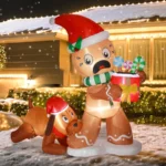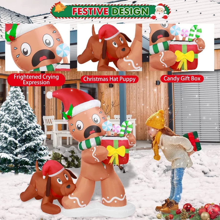 HIGHLIGHT OF CHRISTMAS EVE: This 5 ft inflatable gingerbread man decoration adds a unique touch of fun and warmth to your holiday. A playful little dog has its teeth firmly clamped onto the gingerbread man’s leg, while the gingerbread man holds a candy-filled gift box, with a fearful expression and tearful eyes. Whether placed in your yard or by your doorstep, this decoration is sure to be a standout feature, bringing laughter and delight to your Christmas night and enhancing the festive cheer.