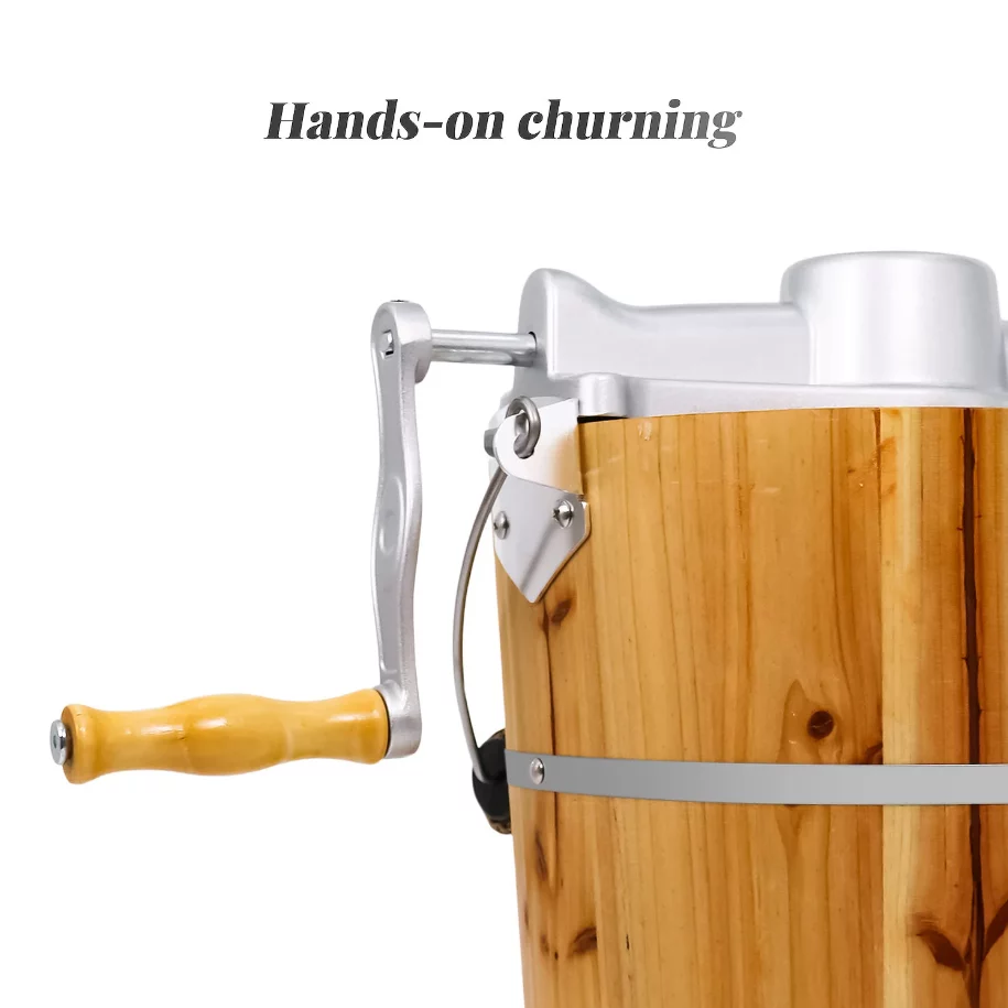 - Includes motor, wooden bucket with handle, stabilizing ring, freezing canister with indent, canister lid and cap, stirrer, dasher paddle and die-cast hand crank