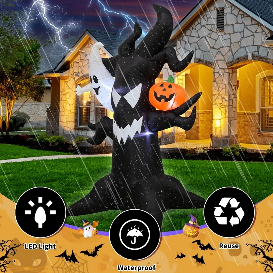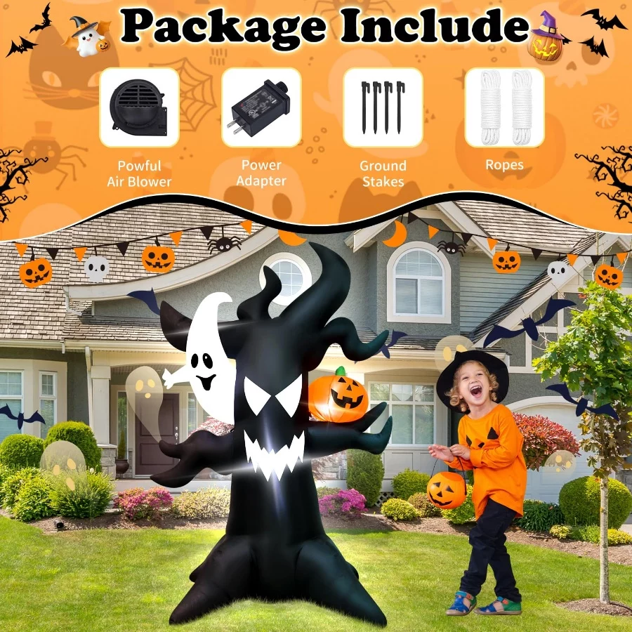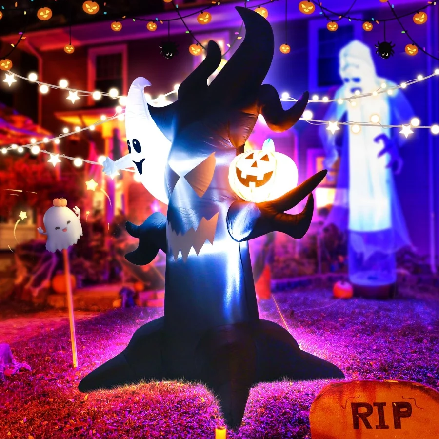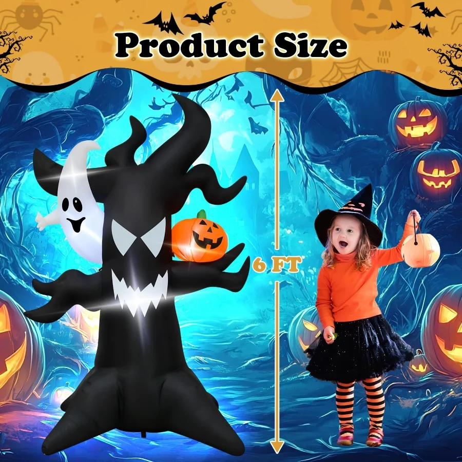 6-foot Halloween Inflatable Haunted Tree with Glowing Ghost & LED Pumpkin: This impressive 6-foot-tall inflatable ghost tree, with glowing ghosts and LED pumpkins on it, immediately creates a stunning Halloween atmosphere. The thickened fabric ensures it remains vibrant in any weather, making it the most eye-catching outdoor decoration in the community!