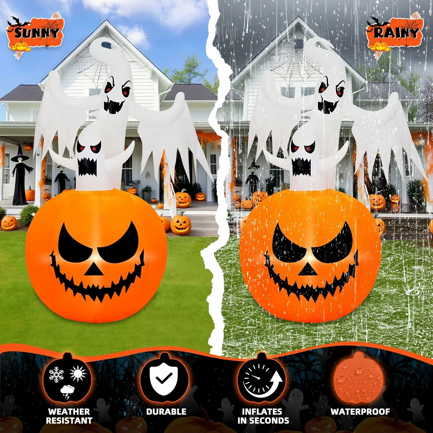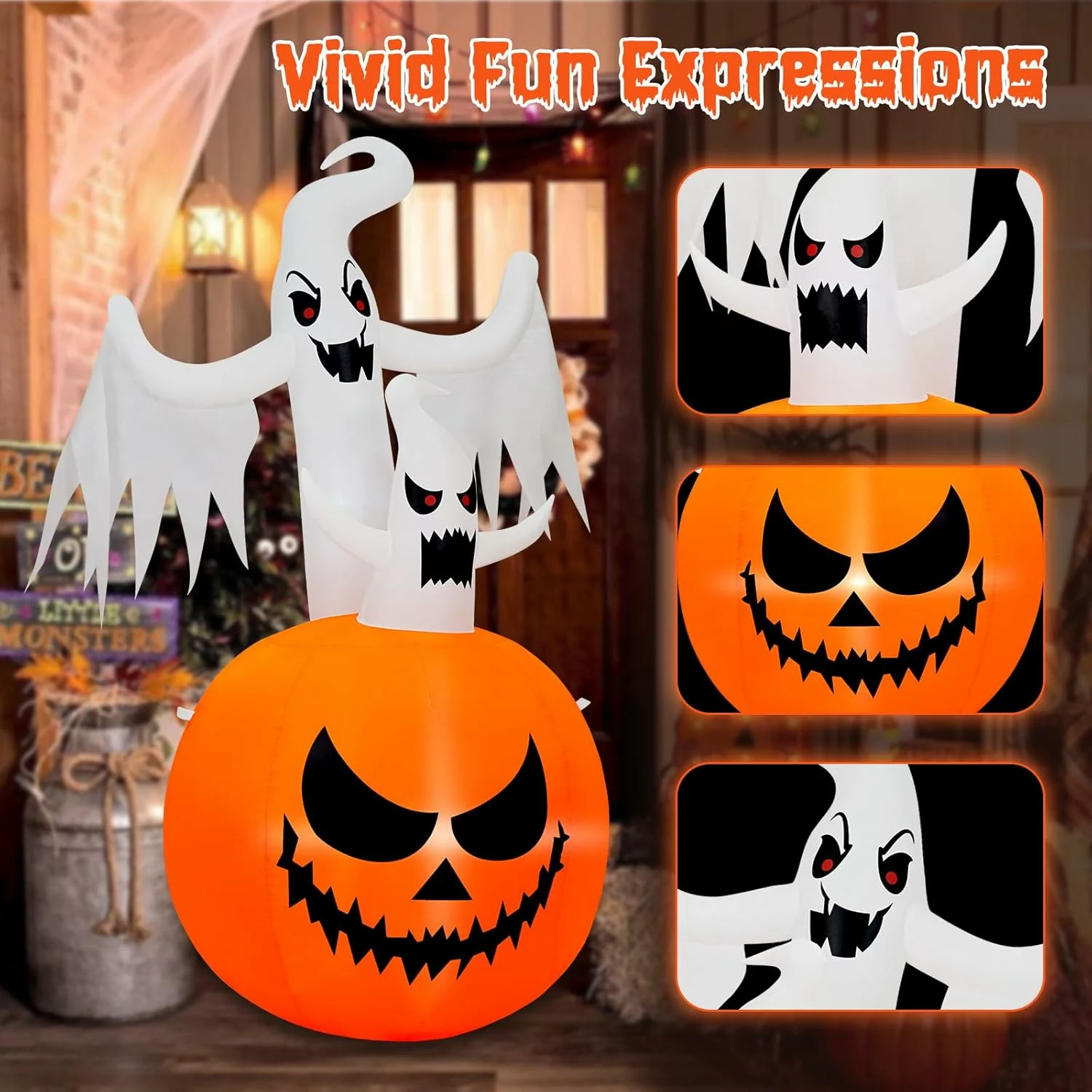 6FT Halloween Inflatable Pumpkin Ghost Outdoor Decor, Blow Up Yard Decoration with Built-in Colorful LED Lights Waterproof