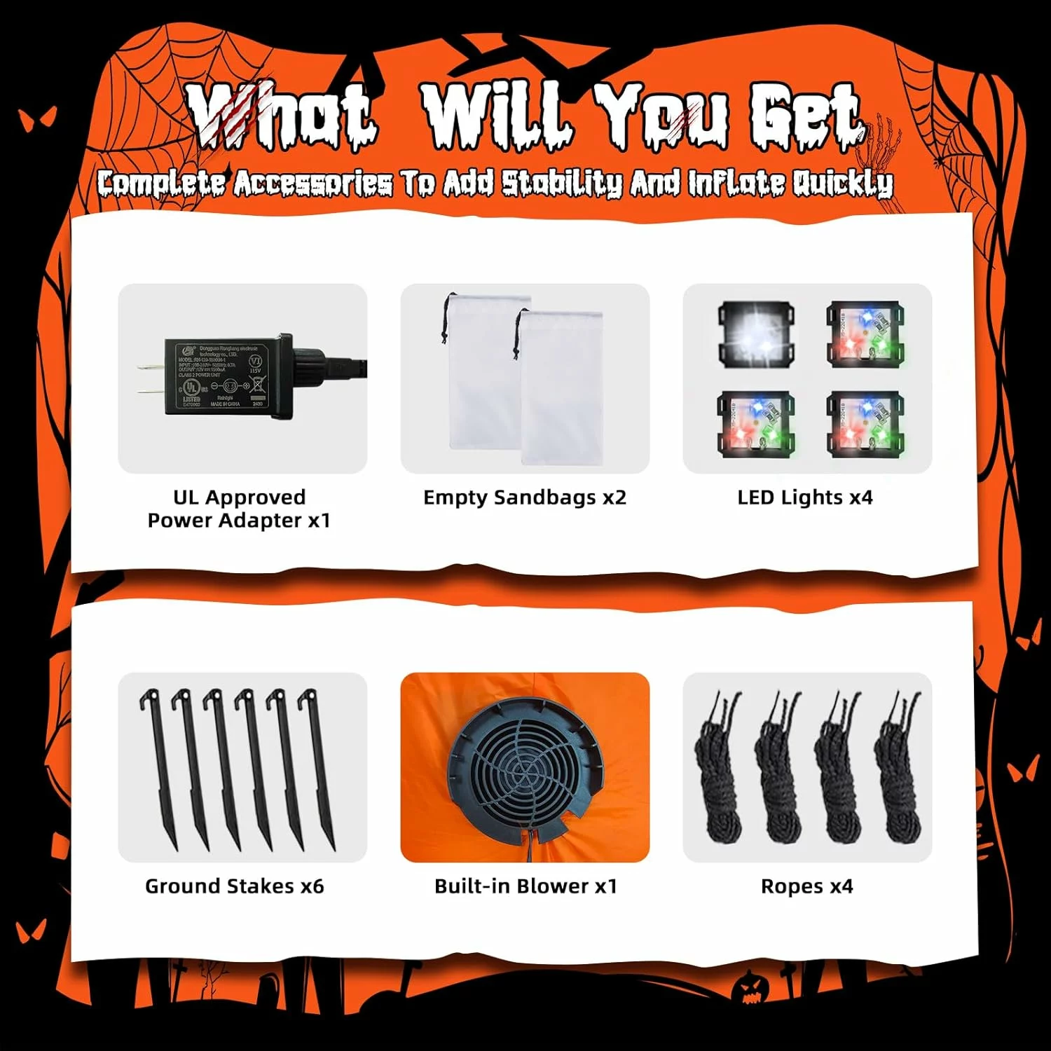 Triple Stability & Safety: Our Halloween inflatables outdoor decorations are equipped with a UL-certified adapter for safety, plus 6 ground stakes, 4 ropes, and 2 empty sandbags (fill them yourself please ), this setup offers maximum stability. The weighted base and stakes prevent tipping, so your inflatable Halloween pumpkin ghost stays perfectly in place all season long. Whether placed in your yard, garden, or porch, this Halloween blow ups are designed to withstand outdoor conditions