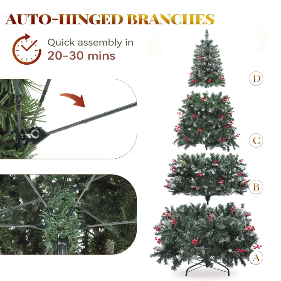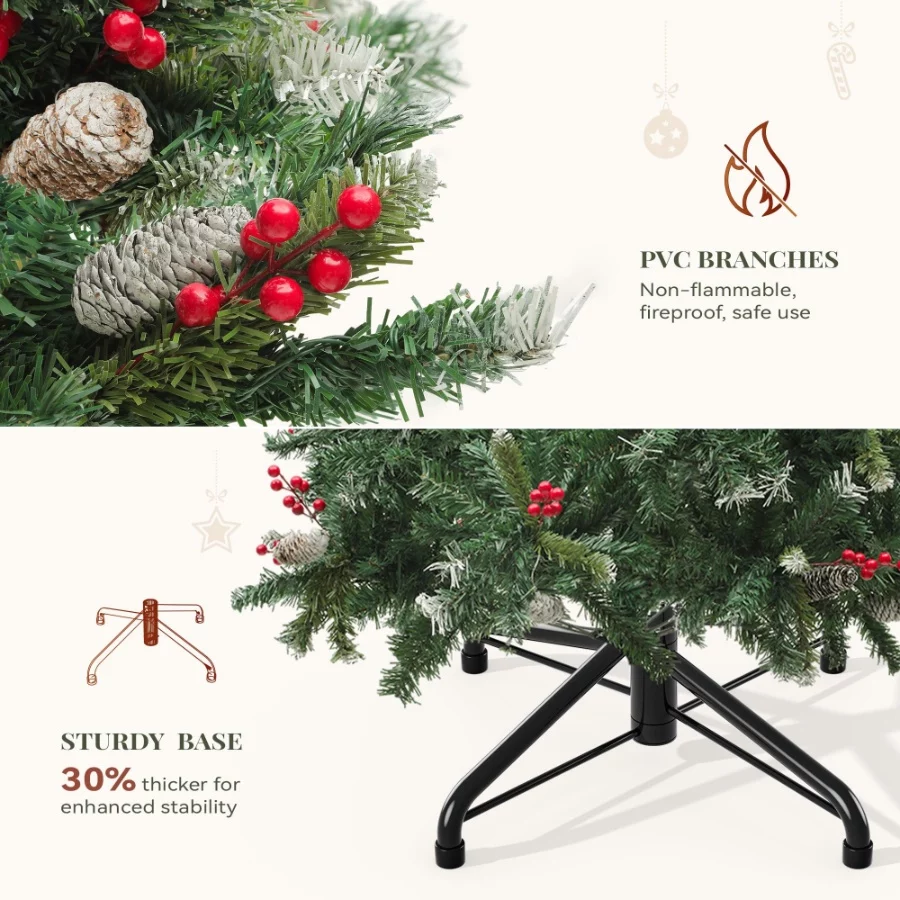 Revel in the vibrant and full presence of our 7.5ft pre-lit, pre-decorated pine hinged artificial Christmas tree, adorned with 1398 lush flocked frosted tips, 82 natural pine cones, and 82 vivid red berries for an enchanting holiday atmosphere.
