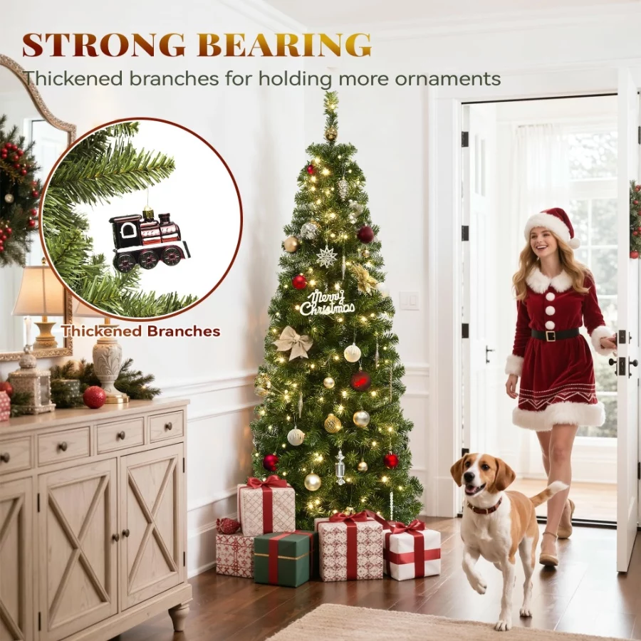 Bring festive magic to small spaces with our elegant pencil Christmas tree! Its slender silhouette fits perfectly in cozy corners while delivering full holiday charm. The pre-lit branches create instant ambiance with twinkling lights, and the sturdy design holds all your favorite ornaments. Effortless to set up and stunning to display, it’s the perfect way to celebrate in style – making every moment merry and bright!
