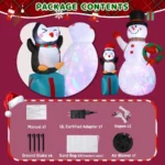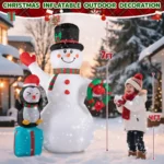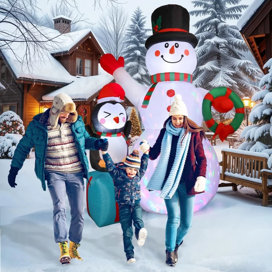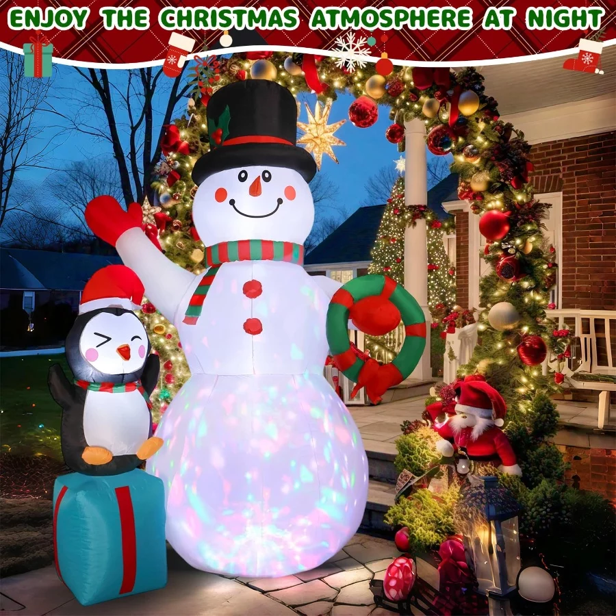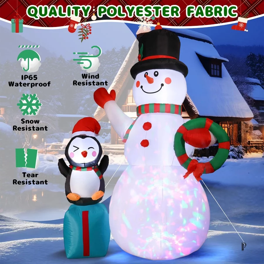 Built to Last: The blow ups snowman is made of high strength waterproof polyester, ensuring outdoor long-lasting use. Plus with excellent stitching improving the durity of inflatable. Even in cold, snowy and rainy days, the inflatable decoration will stand firm.