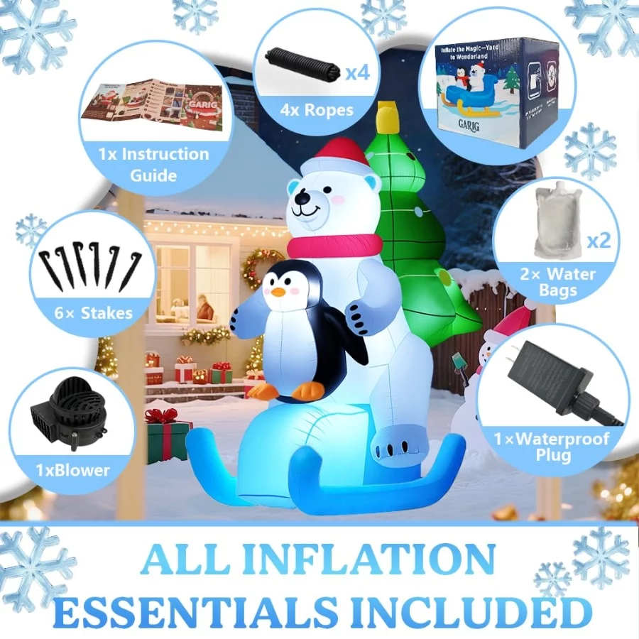 Inflatable Christmas Decorations:GARIG 6FT tall Christmas inflatable decoration is the perfect accent for winter Christmas events and New Year’s parties. Featuring penguins and a polar bear standing on a sled, with a Christmas tree in the background, its unique design creates a strong Christmas atmosphere.