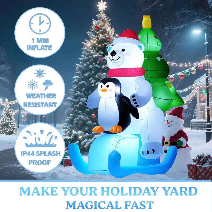 Light Up the Christmas Night: This Christmas blow up yard decorations features 5 built-in high-brightness LED lights to illuminate your yard on Christmas Eve.The glowing white bear skiing with pengui becomes the most eye-catching Christmas inflatable decoration in your yard.