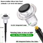 HIGH EFFECT: Solar pathway lights outdoor adopts monocrystalline silicon solar panel and contains 1.2 V 250 mAh Ni CD AAA Battery. They automatically charge during the day, over a period of 4-6 hours. Then, they turn on automatically at night, providing at 6-8 Hours of lighting.