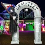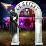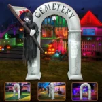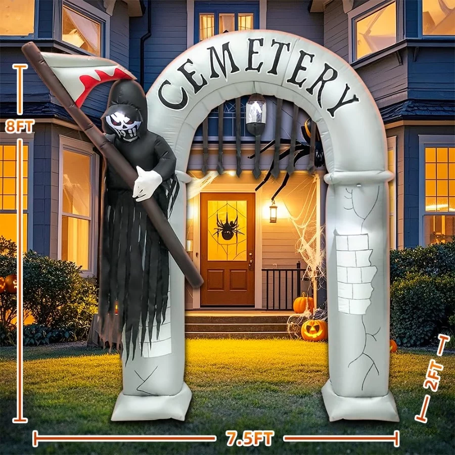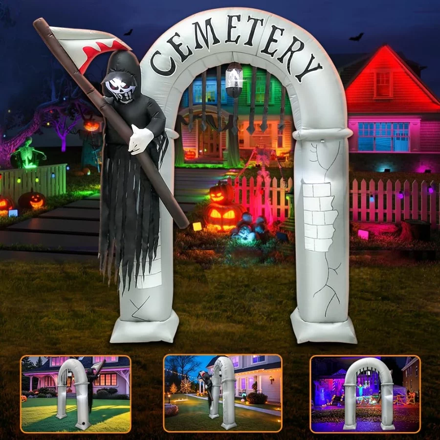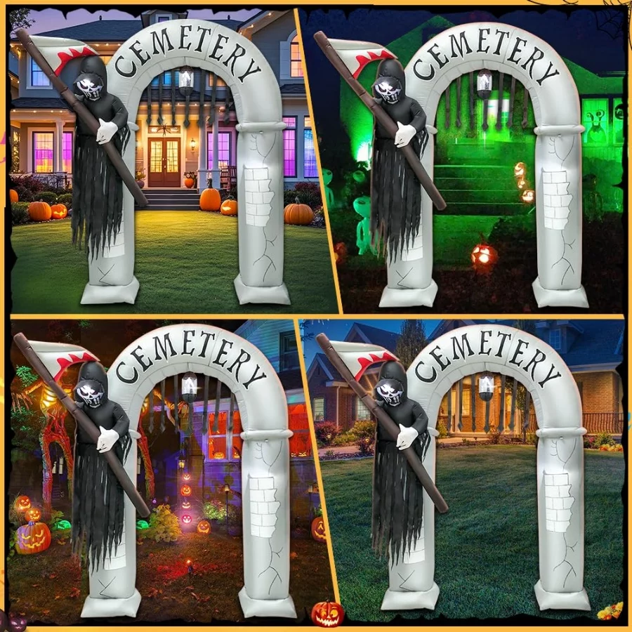 Large Halloween Inflatable: Gaint Grim Reaper archway Inflatable Halloween Decor outdoor, halloween inflatable death’s graveyard arch decoration will illuminate your yard and easily attract the guests, friends, and kids’ attention so that can be the most attractive & halloween decorations outdoor in your neighbors.